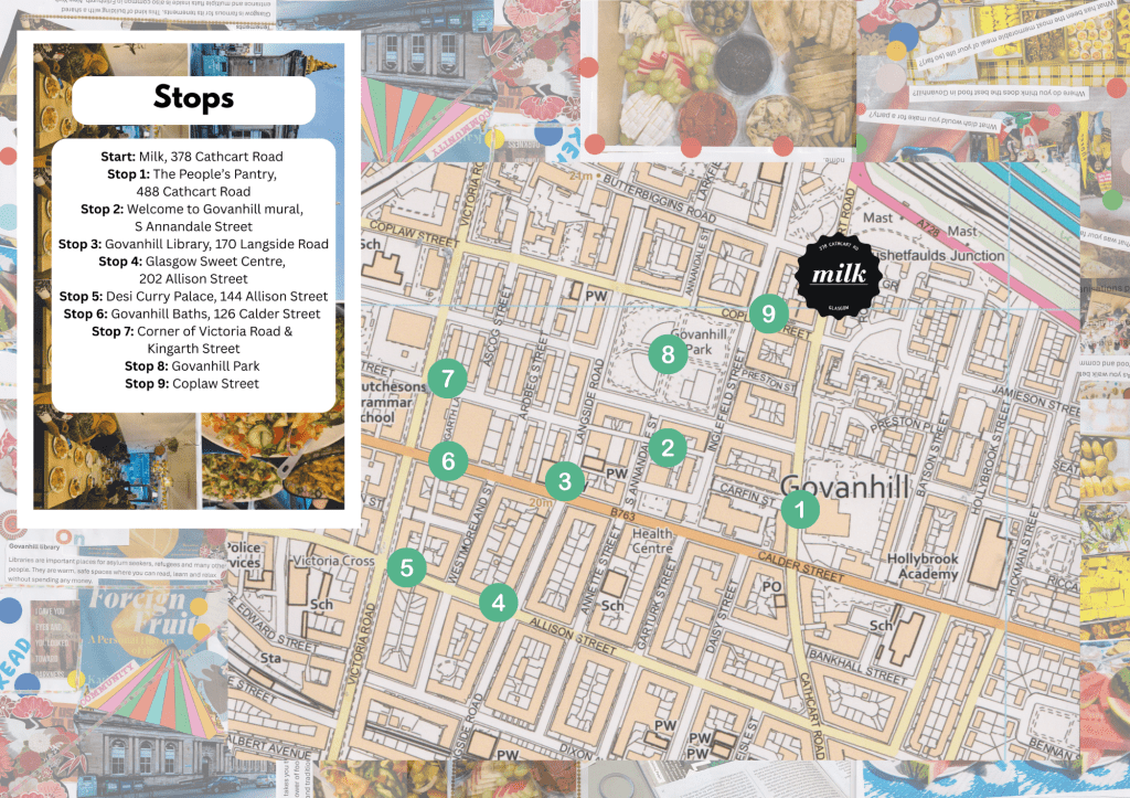 Check out our beautiful new self-guided tour which will take you on a journey through refugee histories and food cultures in the built environment of this Southside neighbourhood. You can follow the route in real life or experience it online. At each stop, listen to audio of the conversations, recommendations and insights of the community historians of Milk Glasgow.