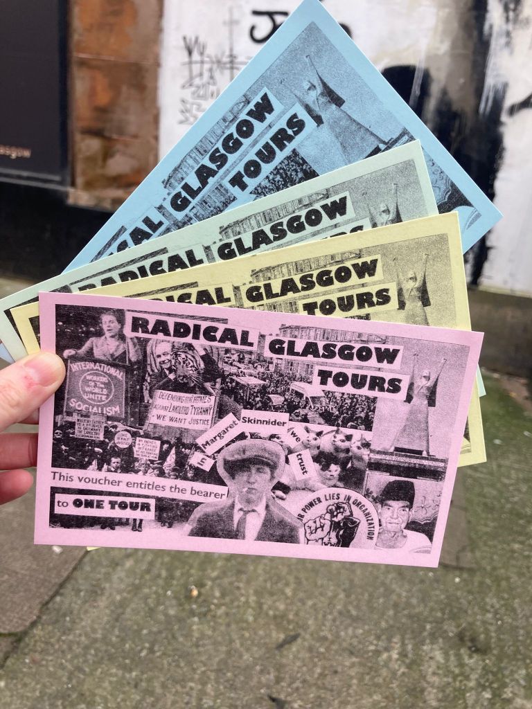 The vouchers have been beautifully riso printed by our pals at Good Press in Glasgow. Also included with each order is a stylish Radical Glasgow Tours magnet and a couple of dual-language anti-racist stickers.