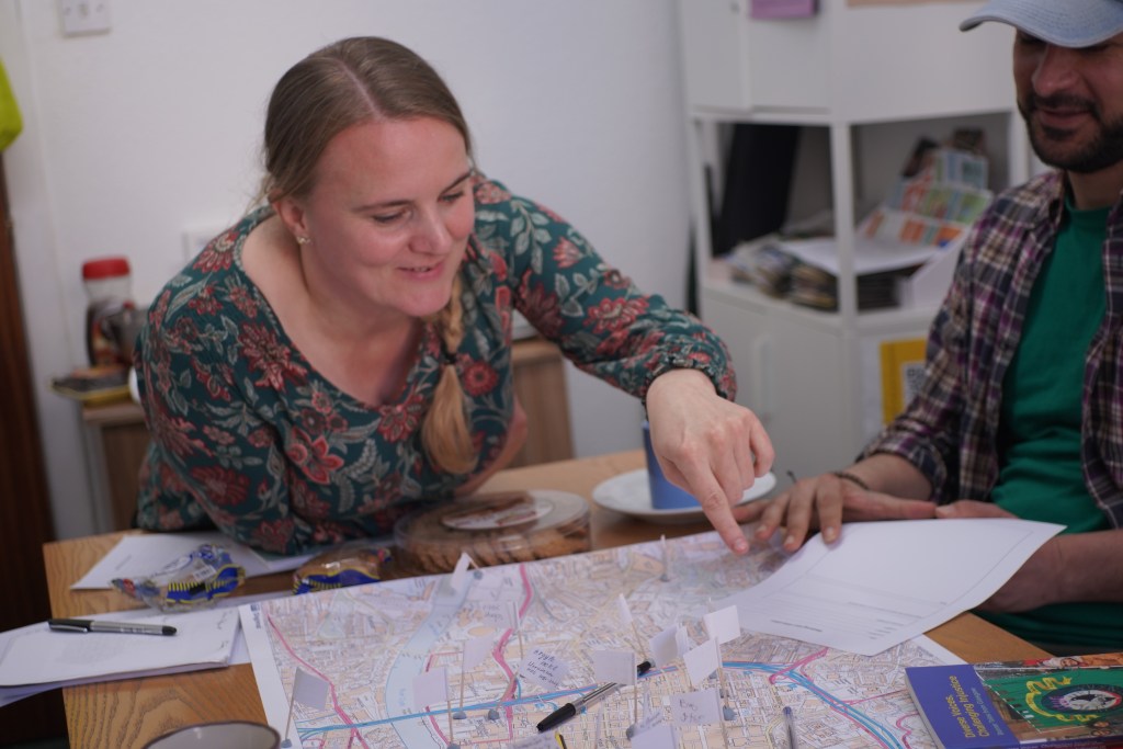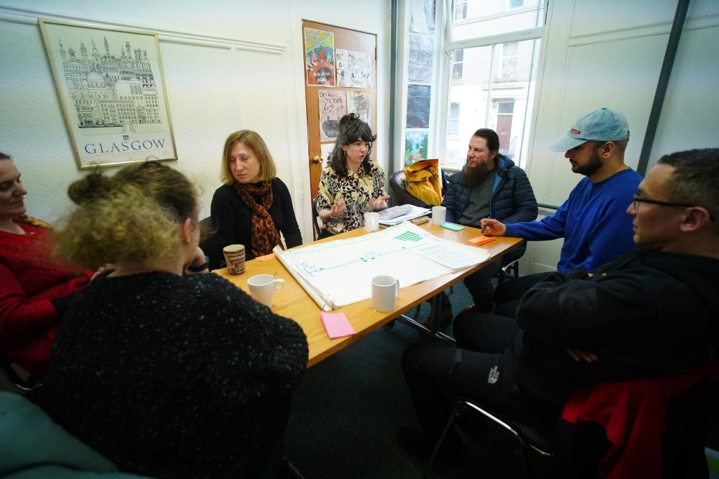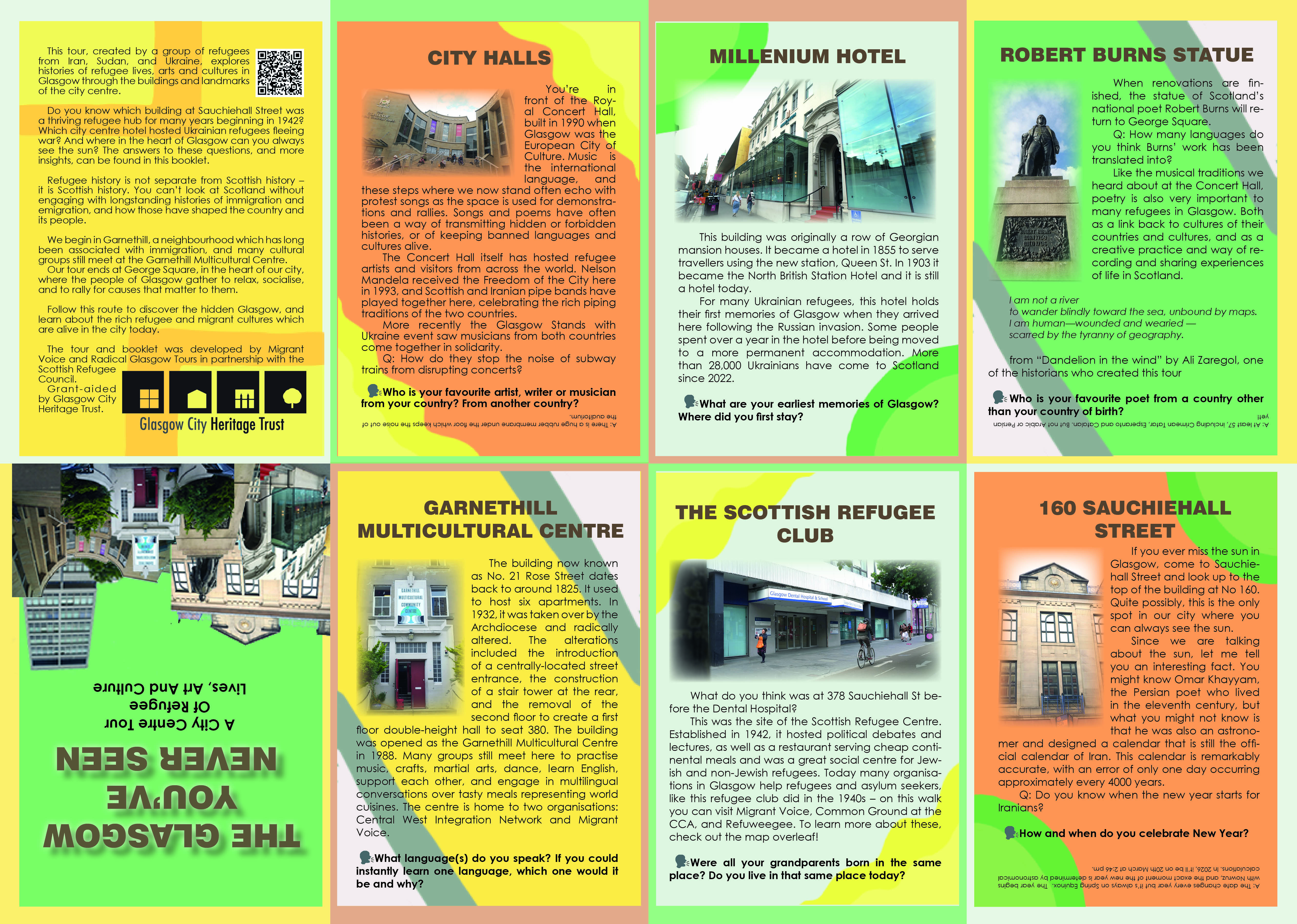 The tour was developed by Oksana Borysova, Osama Daffalla, Yuliia Drymalyk, Lenur Sufianov and Ali Zaregol. Alongside Marzanna Antoniak of Migrant Voice and Katherine Mackinnon of Radical Glasgow Tours, in partnership with the Scottish Refugee Council. Grant-aided by Glasgow City Heritage Trust for Refugee Festival Scotland 2025.