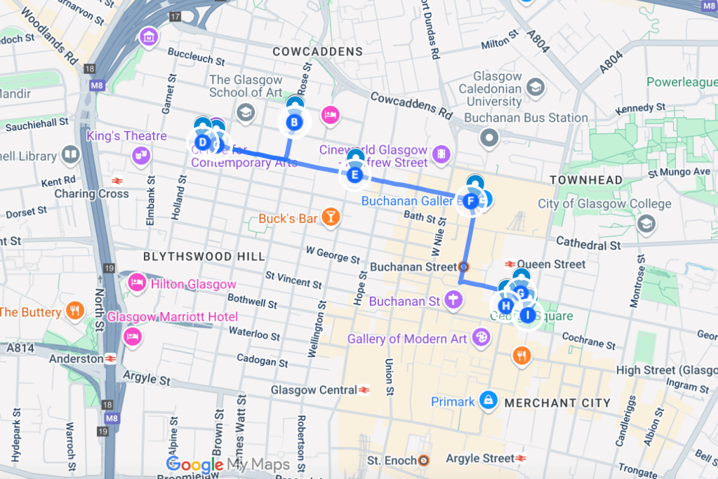 Accessibility: This walk lasts 2km on city pavements and will take you around an hour. There is one steep hill on the route as shown (Scott St); to avoid this you can access Sauchiehall St via Rose St. At the time of writing George Square is closed, meaning seating on the walk is reduced. Some benches are available on Sauchiehall Street. Accessible toilets are available in the Buchanan Galleries during opening hours. For detailed walking directions click on the map:
